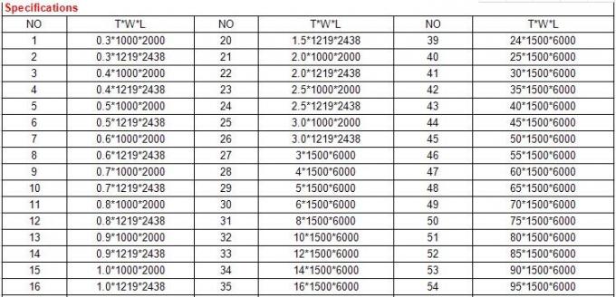 | طول: 2000mm / 2438mm / 3000mm / 6000mm أو صنع وفقا لطلب الزبون | سمك: 0.3mm-200mm، 3.0mm-12.0mm أو حسب الطلب |